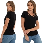 MODNA BLUZKA DAMSKA Z OZDOBNYM DEKOLTEM GŁADKI CZARNA BAWEŁNA ROZMIAR S