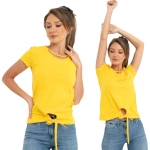 MODNA BLUZKA DAMSKA Z OZDOBNYM WIĄZANIEM DEKOLT GŁADKI ŻÓŁTA ROZMIAR M